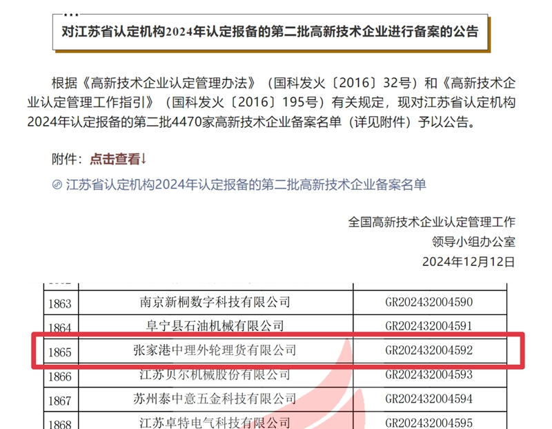 近日,全国高新技术企业认定办公室公告发布第二批高新技术企业备案名单,张家港中理外轮理货有限公司荣列其中!这是张家港中理获得的首个国家级荣誉,更是集团公司以“蝶变五化”深推智慧港口建设的又一重要突破。
