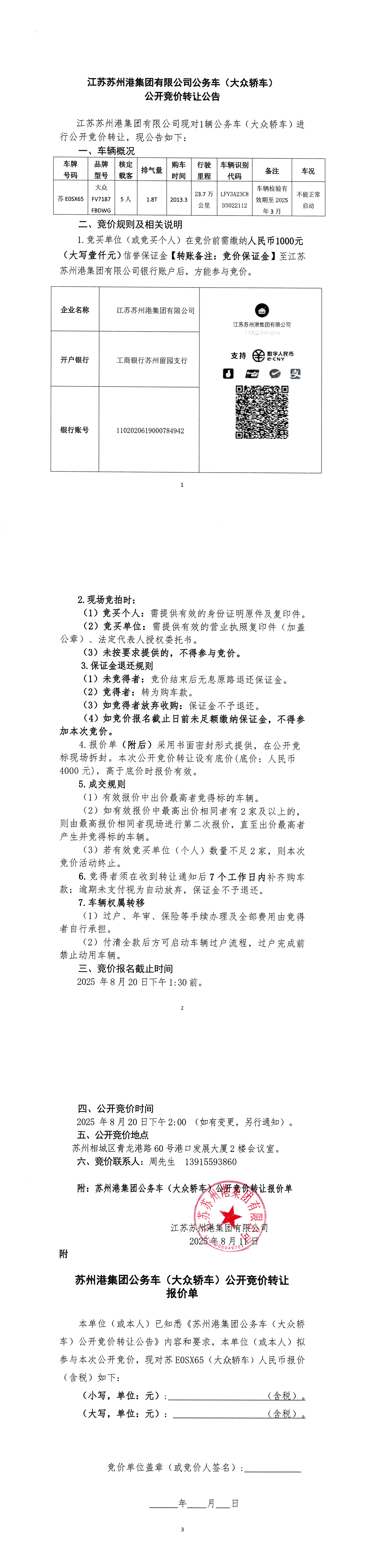 江苏苏州港集团有限公司公务车(大众轿车)公开竞价转让公告