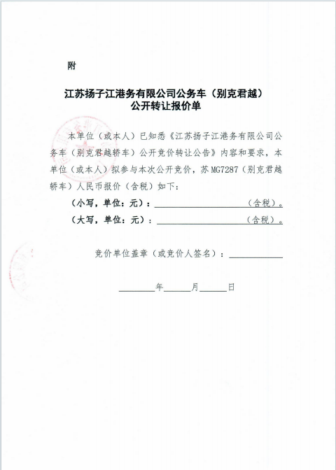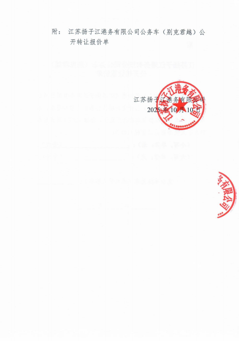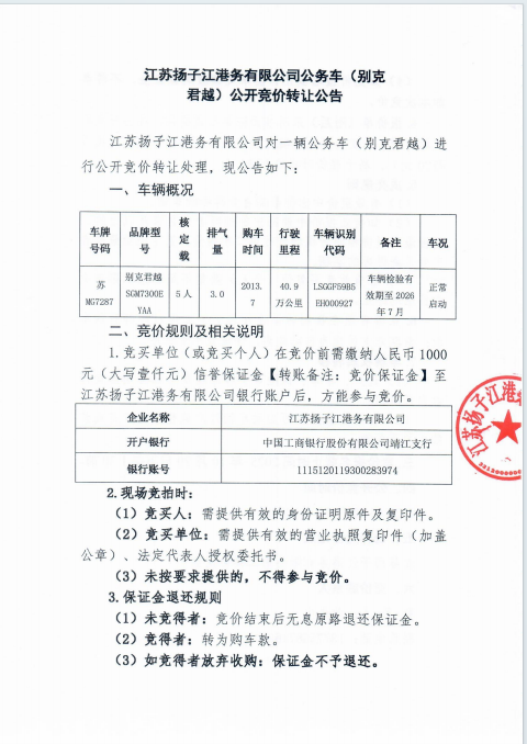 江苏扬子江港务有限公司公务车(别克君越)公开竞价转让公告